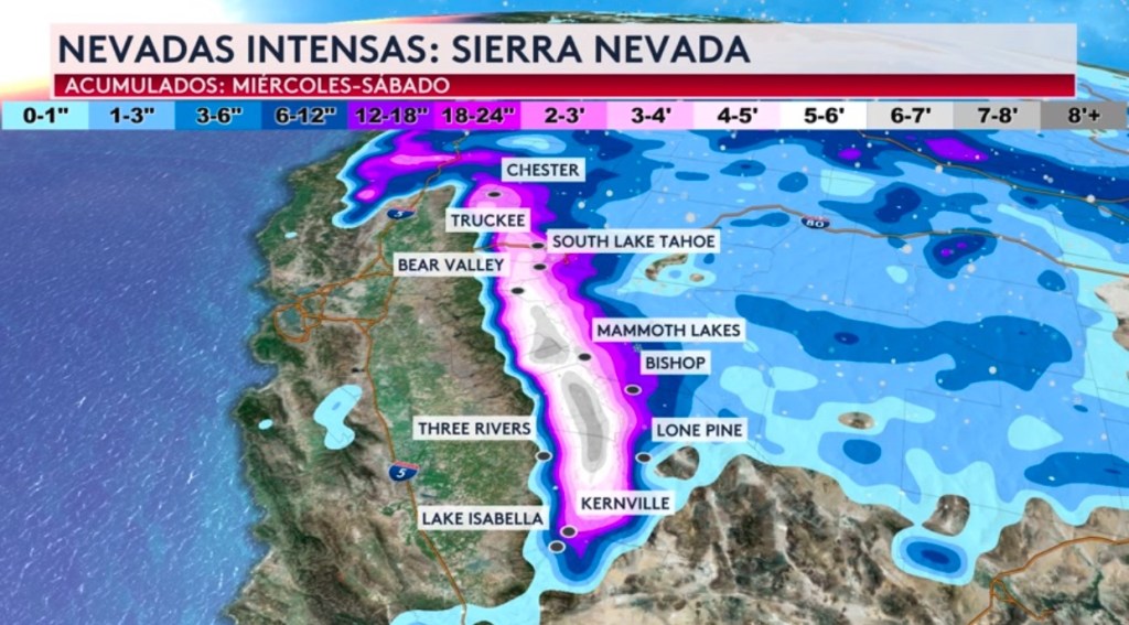 •Se pronostica que se acumule más de 7 pies de nieve en las Montañas Sierra Nevada en California desde el miércoles hasta el sábado por la madrugada. La mayoría de esta nieve será beneficiosa ya que las montañas están por debajo del promedio con respecto a la cantidad de nieve que han recibido esta temporada invernal.