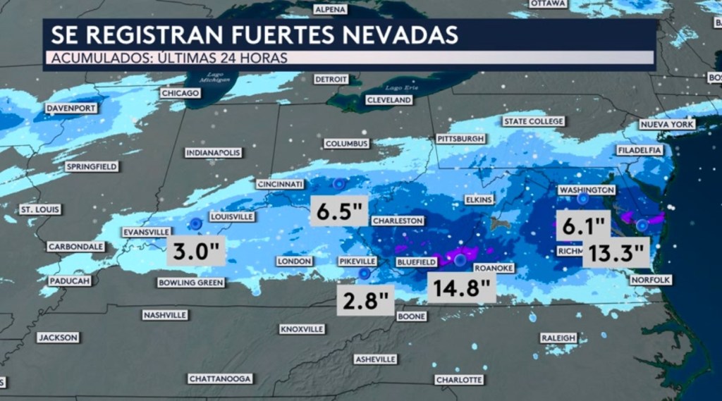 •Se reportaron fuertes nevadas a través del Valle de Ohio y Medio Atlántico en las últimas 24 horas debido al paso de nuestra primera tormenta invernal. ¡Hasta el momento, aunque estos reportes todavía no son oficiales, los estimados de radar muestra hasta 15 pulgadas de nieve al sureste del estado de Virginia Occidental y al oeste del estado de Virginia! También se registró más de un pie en la Península Delmarva que incluyen los estados de Delaware y Maryland mientras que la capital del país Washington DC reportó una acumulación preliminar de 6 pulgadas.