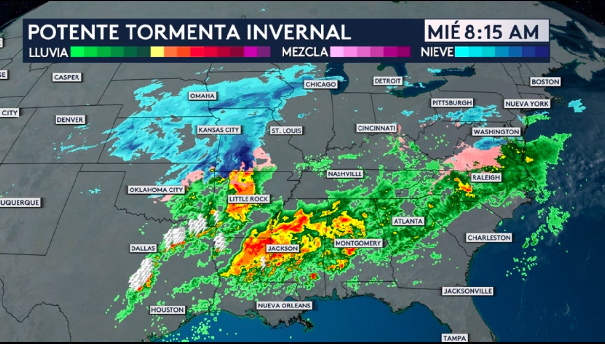 •Esta mezcla invernal continuará avanzando al este durante horas de la tarde con fuertes lluvias para el sureste y nevadas más al norte para el Medio Oeste y los Grandes Lagos. Mucha precaución para ciudades como Atlanta, New Orleans, Jackson, Montgomery, Knoxville, Charlotte y Richmond por las inundaciones repentinas.