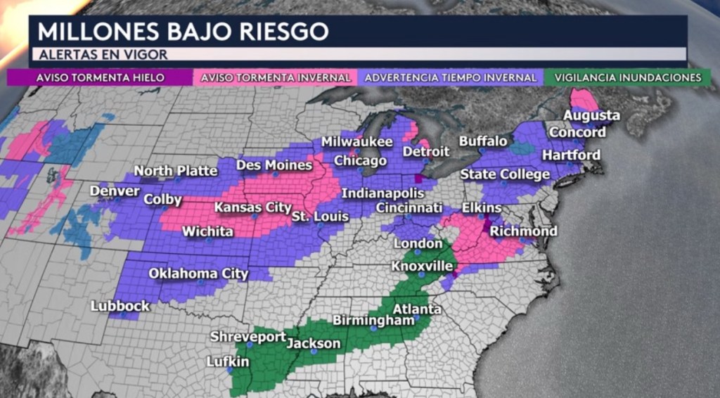 •Como resultado, tenemos varias alertas invernales en vigor desde Colorado hasta Maine que incluyen ciudades como Denver, Oklahoma City, Kansas City, St. Louis, Chicago, Detroit, Indianapolis, Cincinnati, Buffalo y Hartford.
