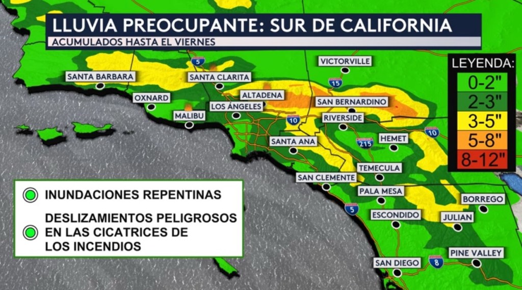 •La lluvia será preocupante para el sur de California donde se pronostican hasta 3 pulgadas en los valles y en la costa y más de 5 pulgadas en las montañas hasta el viernes por la noche. Esto pudiera provocar deslizamientos de tierra peligrosos en los condados de Los Angeles y Ventura como antes mencionado.