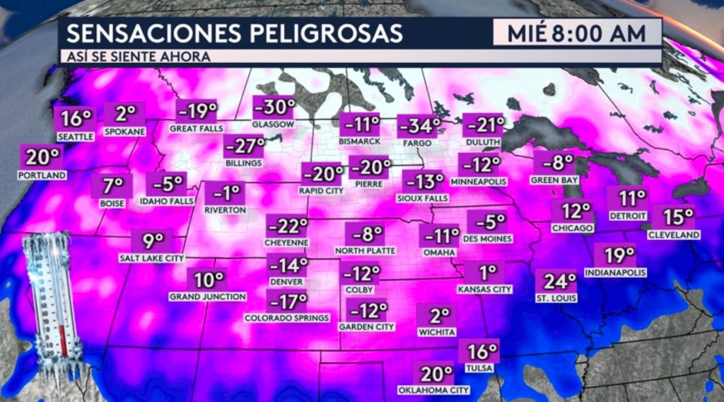 •Estamos observando otro amanecer frío hacia el norte, noroeste y centro del país con sensaciones térmicas bajo cero tan al sur como los estados de Colorado y Kansas. La sensación térmica esta mañana está tan fría como 35° bajo cero en Dakota del Norte y Montana. Se siente a esta hora como un grado bajo cero en Minneapolis, 16° bajo cero en Denver, 2° bajo cero en Kansas City, 6° en Salt lake City y 14° en Seattle y Chicago.
