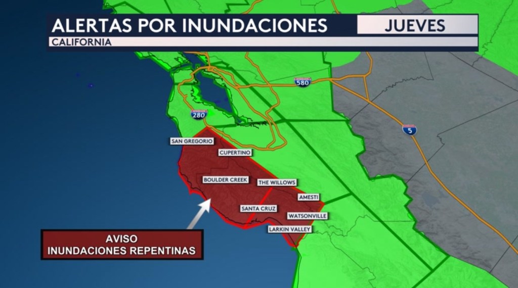 •Debido a estas fuertes lluvias, se ha emitido un aviso de inundaciones repentinas justamente al sur de la Área de la Bahía hasta las 9:15 AM hora del oeste para ciudades como Santa Cruz, Amesti y Watsonville. Hasta 3 pulgadas de lluvia ha caído en esta zona con 3 pulgadas adicionales posibles.