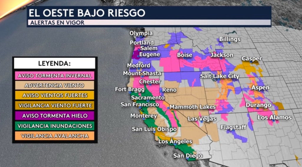 •No solo estaremos viendo mal tiempo en California con este río atmosférico sino a través del oeste del país también. Tenemos a varias alertas en vigor para los vecinos estados de California por fuertes vientos, lluvias torrenciales, nevadas intensas, acumulaciones de hielo y hasta de avalancha en las montañas.