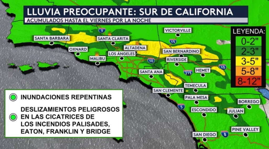 Se pronostican hasta 3 pulgadas de lluvia acumulable en la costa y los valles y hasta 8 pulgadas aisladas en las Montañas San Bernardino, San Gabriel, Santa Susana, Santa Ana, Santa Rosa, San Jacinto y Laguna. Los acumulados están válidos hasta el viernes por la noche.