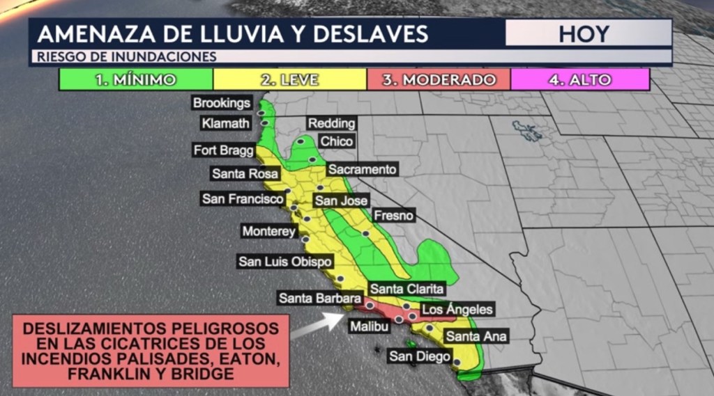 •La lluvia será preocupante para el sur de California debido al peligro de deslizamientos de tierra y flujos de escombro en las cicatrices de los incendios Palisades, Eaton, Franklin y Bridge en los condados de Los Angeles y Ventura.