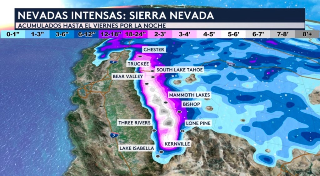 •Las nevadas en las Montañas Sierra Nevada en California serán importantes. ¡Se pronostica que se acumulen más de 8 pies hasta el viernes por la noche!