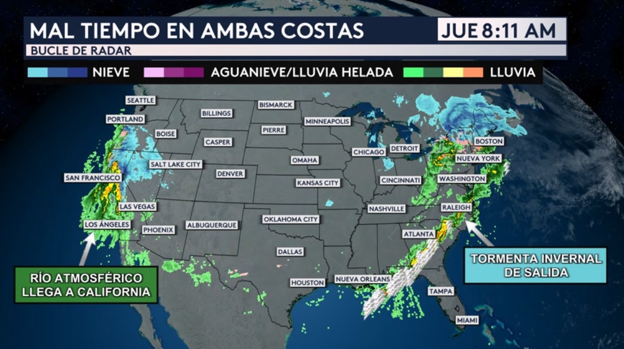 •Estamos vigilando mal tiempo en amabas costas del país esta mañana. El bucle de radar muestran dos tormentas: una saliendo de la costa este que trajo tormentas severas, fuertes nevadas y lluvias torrenciales y otra entrando a la costa oeste y trayendo fuertes lluvias, nevadas y vientos.