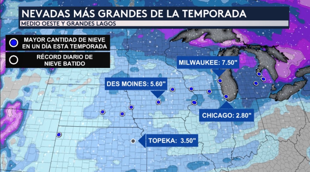 Todo los puntos azules representan ciudades que tuvieron la mayor cantidad de nieve de un solo día esta temporada de invierno. Esto incluyen las ciudades de Chicago, Milwaukee, y Des Moines. El único punto negro en el mapa representa la ciudad de Topeka, la capital del estado de Kansas, que batió un récord diario de nieve.