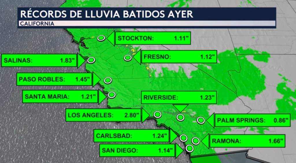 •Se batieron varios récords de lluvia a través del estado de California ayer debido a nuestro río atmosférico significativo. Esto incluyen ciudades como Los Angeles, San Diego, Riverside, Fresno y Santa Maria. ¡Los Angeles recibió la mayor cantidad de lluvia de todas las ciudades mostradas con una acumulación de 2.8 pulgadas!
