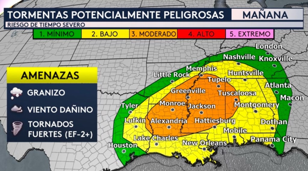 •Habrá un riesgo peligroso de tormentas severas para el sur del país desde el sábado hasta el domingo por la noche. Todas las amenazas severas serán posibles como granizo, vientos dañinos y tornados pero en la zona naranja habrá un riesgo moderado (nivel 3 de 5 en la escala de severidad) donde se pudieran observar tornados intensos de categoría EF-2 o mayor (111 mph+) tanto por día como por las horas de la noche. Esto incluyen ciudades como Alexandria, Monroe, Jackson, Hattiesburg, Greenville, Tupelo y Tuscaloosa.
