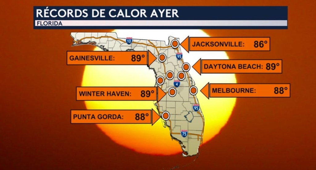 •Se empataron o batieron múltiples récords de calor en el estado de Florida ayer mientras que siguen lidiando con un calor parecido a la de mayo o junio. Esto incluyen ciudades como Jacksonville, Melbourne, Daytona Beach, Punta Gorda, Winter Haven y Gainesville donde registraron temperaturas máximas en los altos 80°.