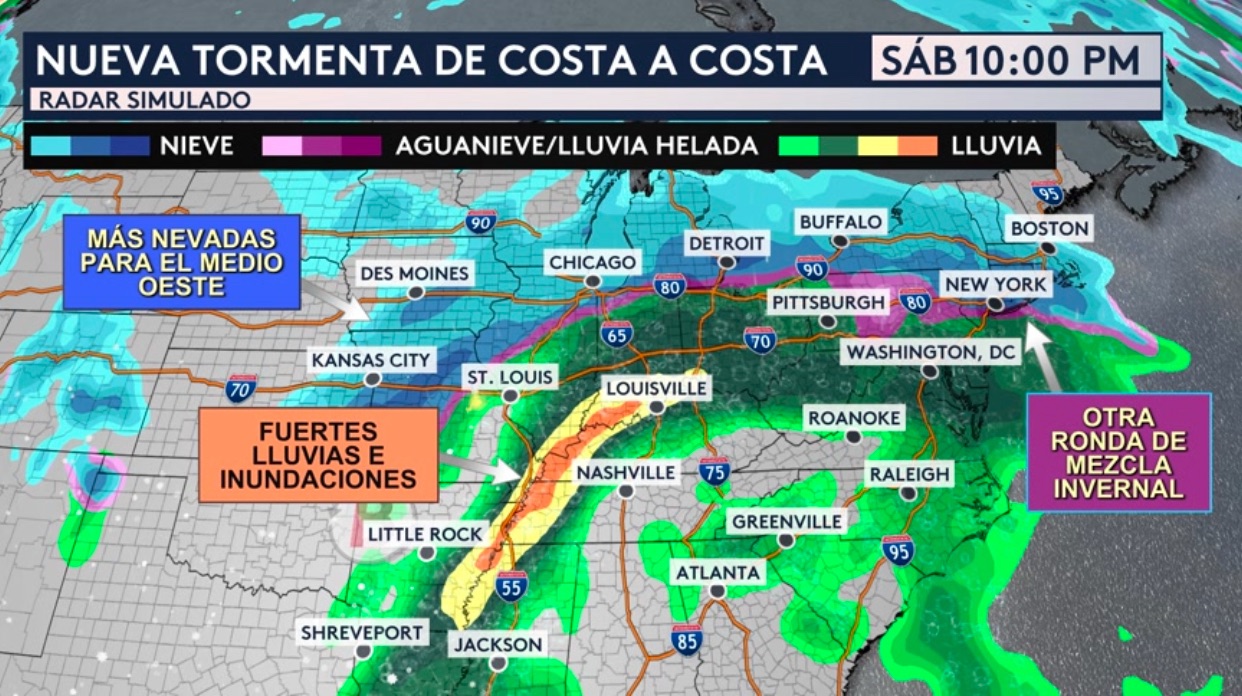 •Esta misma tormenta atravesará el país entero durante fin de semana, trayendo una mezcla de precipitación y lluvias y tormentas potencialmente peligrosas para el sur y este el sábado y domingo. Si vemos la imagen de radar a partir del sábado por la noche, estará nevando en el Medio Oeste, Grandes Lagos y Nueva Inglaterra y lloviendo intensamente sobre los Valles de Mississippi, Tennessee y Ohio. Acumulados de hielo peligrosos también serían posibles para el Medio Atlántico y Nueva Inglaterra de hasta tres cuartos de una pulgada.