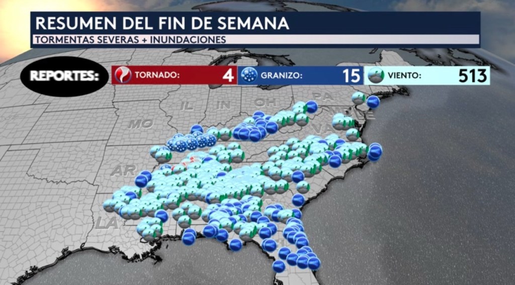 El sábado y domingo hubo 4 reportes de tornado y 15 de granizo a través de los Valles de Mississippi y Tennessee, el sureste del país y tan al norte como los estados del Medio Atlántico. ¡Pero quizás el número más importante fue los 513 reportes de viento dañino!