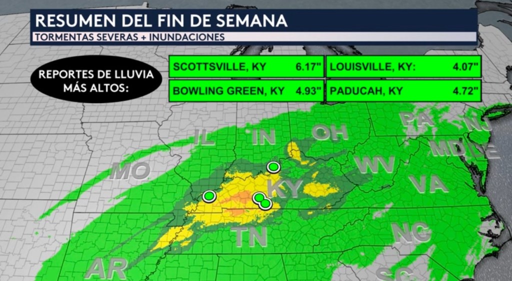 Las lluvias fueron intensas y significativas al norte de Tennessee y especialmente al oeste de Kentucky donde se observan los colores amarillos y naranjas. Más de 6 pulgadas se registraron en algunos sectores de Kentucky y Tennessee. Las siguientes ciudades en Kentucky registraron al menos 4 pulgadas dentro del periodo de 48 horas desde sábado hasta el domingo : Scottsville (6.17 pulgadas), Louisville (4.07 pulgadas), Paducah (4.72 pulgadas) y Bowling Green (4.93 pulgadas). Estas lluvias e inundaciones catastróficas causaron 9 fatalidades en el estado de Kentucky.