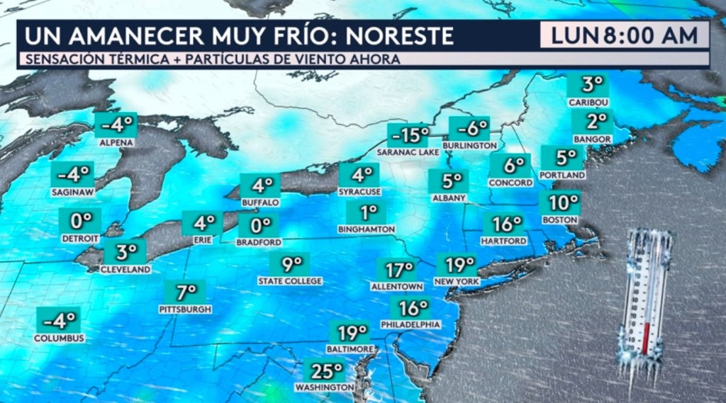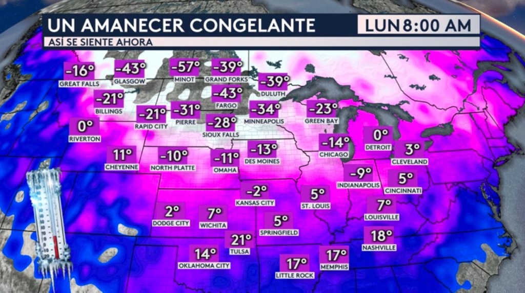 •No solo estamos experimentando sensaciones térmicas frías en el noreste sino también al norte y centro del país. ¡Se está sintiendo tan frío como 57° bajo cero en Dakota del Norte a esta hora de la mañana! Se siente como 14° bajo cero en Chicago, 34° bajo cero en Minneapolis, 2° bajo cero en Kansas City, 7° en Louisville y 14° en Oklahoma City.