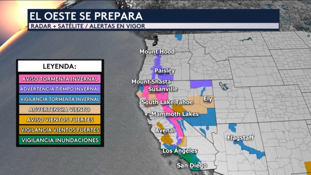 También hay advertencias/avisos por fuertes vientos para el Valle de Sacramento al norte de California, para las montañas costeras de California y para parte del estado de Nevada.