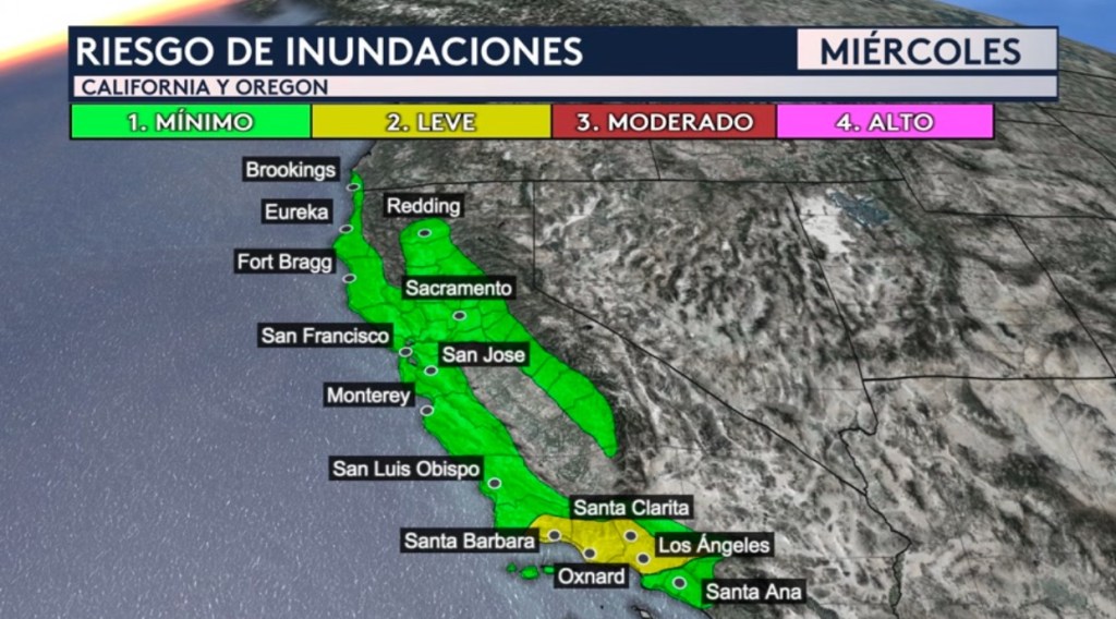 Hay un riesgo un poco más elevado (nivel 2 de 4 en la escala de severidad) de inundaciones en el color amarillo para ciudades como Los Angeles, Santa Monica, Malibu, Santa Clarita, Altadena, Pasadena, Long Beach, Oxnard, Ventura, Thousand Oaks, Camarillo y Santa Barbara debido a la vulnerabilidad de los suelos sueltos por los incendios forestales.