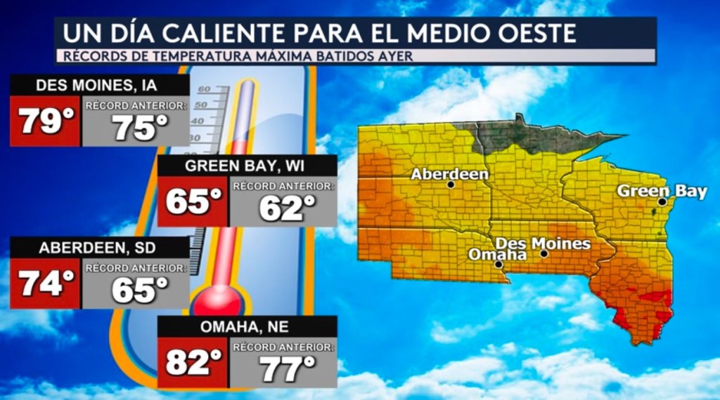 •Más al este hacia el Medio Oeste del país, estamos observando un escenario completamente distinto donde ayer se batieron récords de temperatura máxima en ciudades como Des Moines en Iowa, Green Bay en Wisconsin, Aberdeen en Dakota del Sur y Omaha en Nebraska. ¡Aberdeen rompió su récord diario por 9°!