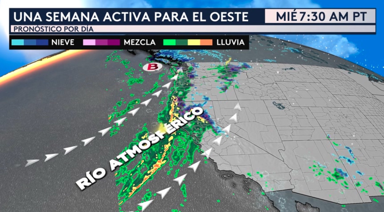 Este potente río atmosférico traerá impactos generalizados el miércoles y jueves para el oeste que incluyen lluvias torrenciales en las elevaciones bajas, nevadas intensas en las montañas, fuertes vientos y tormentas eléctricas.