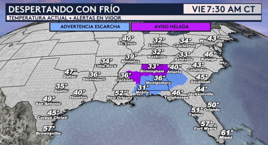 •El sureste de EE. UU. está despertando con frío esta mañana. Las temperaturas actuales están mostradas igual que las advertencias por escarcha y avisos por helada que están en vigor para los estados de Mississippi, Alabama y Georgia. Atlanta, Birmingham, Montgomery y Mobile están bajo estas alertas por frío mientras que reportan temperaturas actuales en el rango de los 30°.