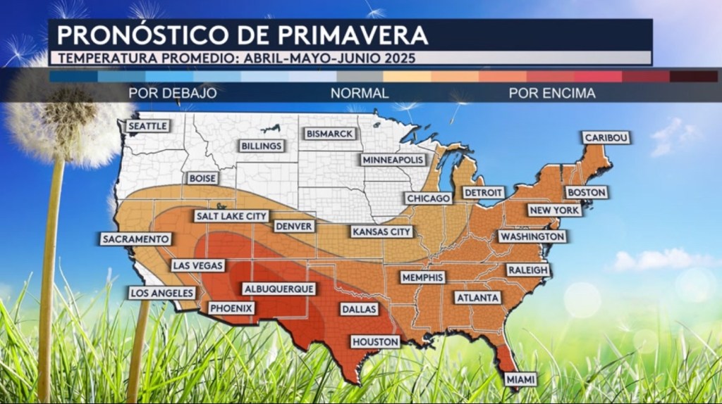 •¡Ayer fue el primer día de primavera astronómica! En coordinación, el Centro de Predicción del Clima ha publicado su pronóstico de temperaturas para los meses de primavera en EE. UU. Según el mapa sombreado mayormente con colores anaranjados y rojos, se esperan temperaturas por encima del promedio para gran parte del sur y este del país para los meses de abril, mayo y junio.