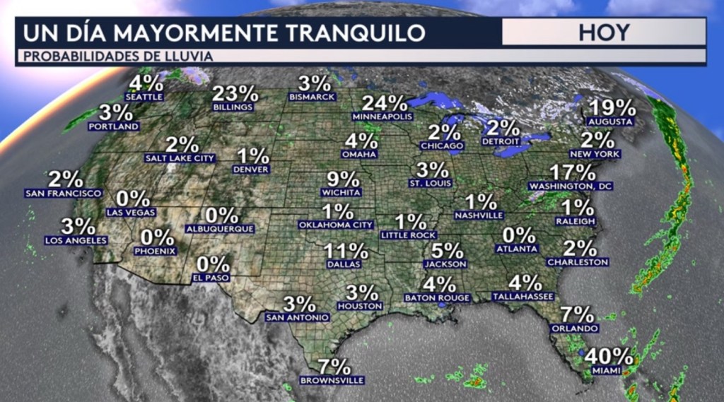 Aparte de esta actividad ligera de precipitación que pudiera afectar a la capital de nuestro país Washington DC, se espera buen tiempo para la mayoría de EE. UU. Las probabilidades de lluvia a nivel nacional están mostradas.