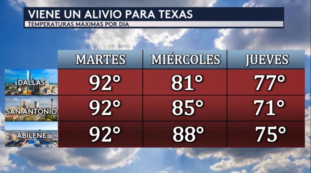 •Pero se espera un alivio de este calor para ciudades en Texas como Dallas, San Antonio y Abilene. Hoy estarán registrando temperaturas máxima en el rango de los 90° y partir del jueves estarán más fresco en el rango de los 70°.