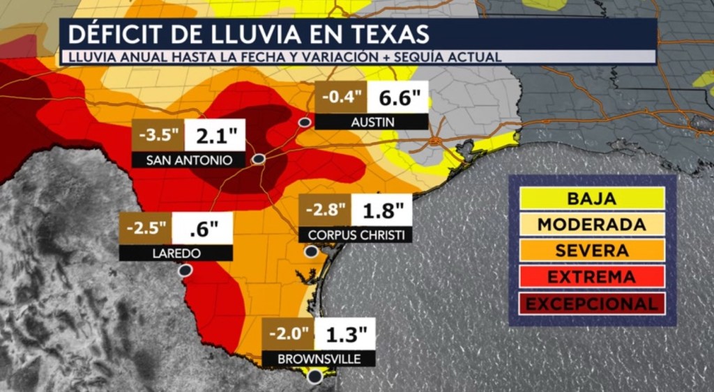 •Partes de Texas están experimentado una sequía extrema y excepcional (los dos niveles de sequía más altos). Esto incluyen las ciudades de San Antonio, Austin y Laredo. Las ciudades mostradas (San Antonio, Laredo, Corpus Christi y Brownsville) excepto Austin están más de 2 pulgadas por debajo del promedio con respecto a la cantidad de lluvia que han recibido en el año.