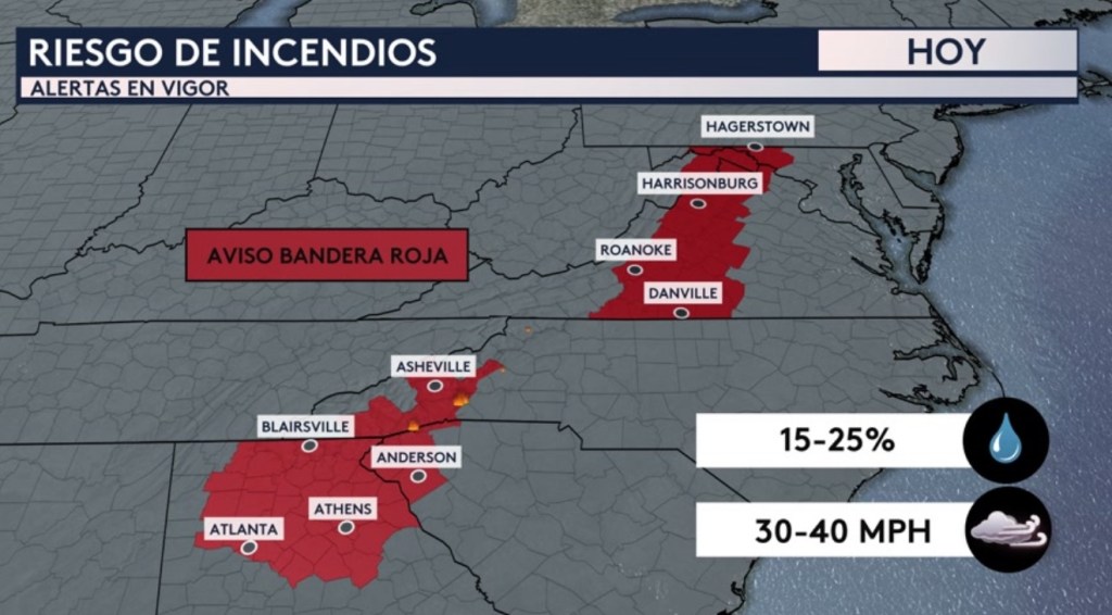•El riesgo de la propagación de los incendios se mantendrá para la zona de los Apalaches hoy debido a las fuertes ráfagas de viento de entre 30 a 40 mph y humedades relativas tan bajas como el 15 %. Por ello hay avisos por bandera roja desde Georgia hasta Maryland al este de los Apalaches que incluyen ciudades como Atlanta y Athens en Georgia; Anderson en Carolina del Sur; Asheville en Carolina del Norte, Roanoke en Virginia y Hagerstown en Maryland. Todos los incendios antes mencionados en las Carolinas están dentro de esta zona de condiciones atmosféricas favorables para la propagación de los incendios forestales.