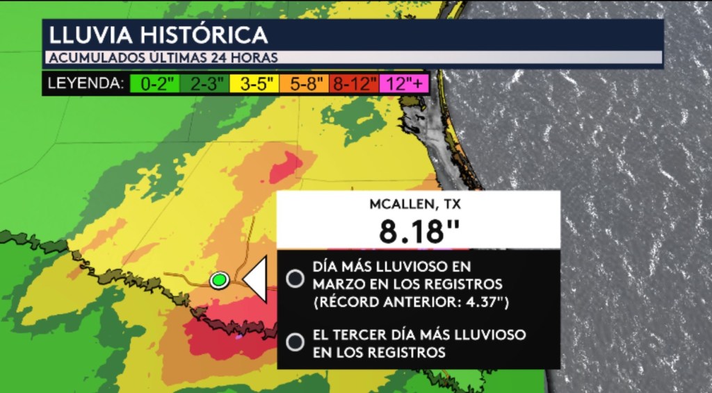 •La ciudad de McAllen al sur de Texas registró una acumulación de lluvia de 8.18 pulgadas ayer. ¡Esto fue el día más lluvioso en marzo en los registros, casi el doble del récord anterior de 4.37 pulgadas! También fue el tercer día más lluvioso en los registros.