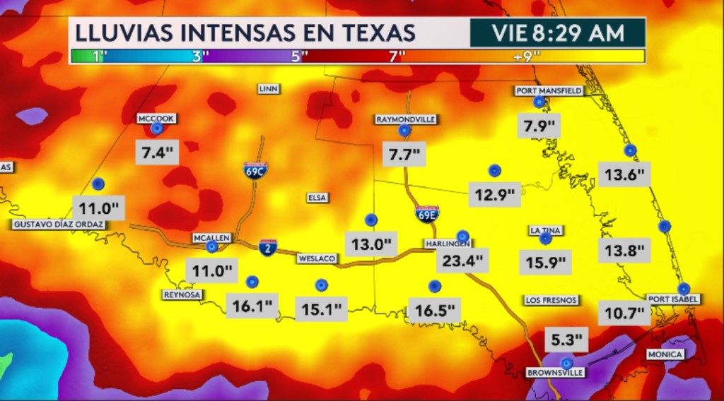 •Se han registrado lluvias intensas al sur de Texas durante las últimas 24 horas. ¡Si vemos a los estimados de radar, hasta 23 pulgadas de lluvia cayeron en la ciudad de Harlingen! Al menos un pie de lluvia (12 pulgadas) se acumuló en la zona sombreada con el color amarillo.