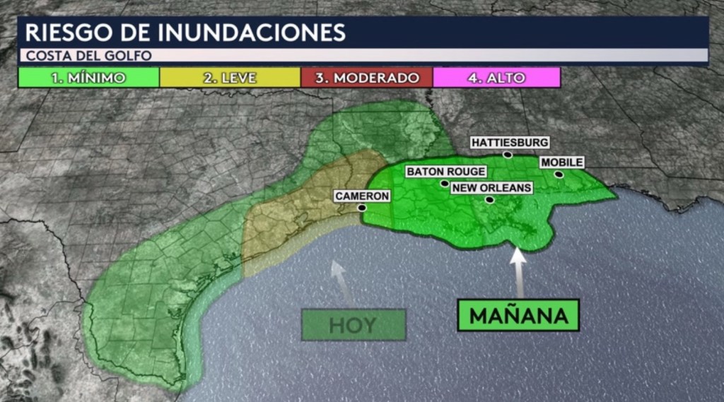 Para mañana, estas fuertes lluvias seguirán avanzando al este a lo largo de la costa del golfo y ciudades como New Orleans y Baton Rouge en Louisiana; Hattiesburg, Gulfport y Biloxi en Mississippi; Mobile en Alabama y Pensacola en Florida estarán bajo un riesgo mínimo de experimentar inundaciones repentinas.
