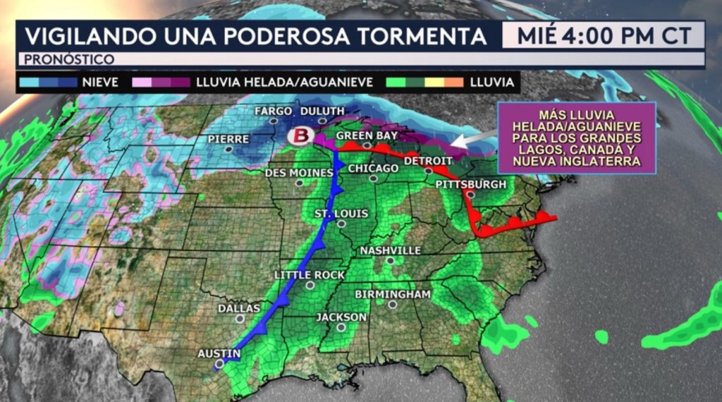 A partir del miércoles por la tarde, el sistema de baja presión avanza al este hacia el Medio Oeste y seguirá produciendo tiempo invernal al norte de su centro. Se espera nuevamente un riesgo de lluvia helada/aguanieve para los Grandes Lagos, Canadá y Nueva Inglaterra como resultado.