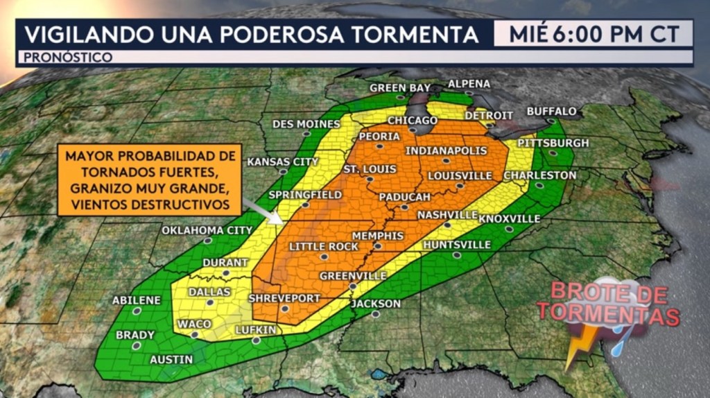 Al sur por delante del frente frío y debajo del frente cálido es donde esperamos esas lluvias y tormentas eléctricas. Aquí es donde se pronostica un brote de tormentas severas para el día entero del miércoles para una extensa zona desde Texas hasta el estado de Nueva York. La zona sombreada con el color anaranjado que incluye ciudades como Chicago en Illinois; Indianápolis en Indiana; St. Louis en Missouri; Louisville y Paducah en Kentucky; Memphis en Tennessee; Little Rock en Arkansas; y Shreveport en Louisiana estará bajo riesgo de tornados fuertes de categoría EF- 2 (111 mph+) o mayor, vientos destructivos de fuerza de huracán y/o granizo dañino muy grande de más de 2 pulgadas en diámetro (tamaño de un limón).