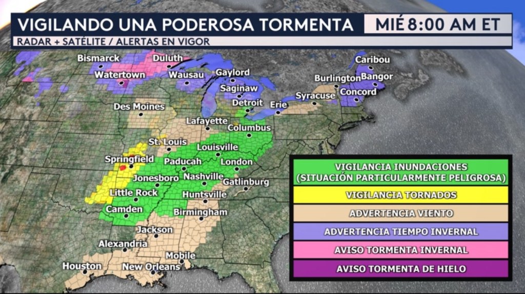 Al norte tenemos alertas en vigor por el tiempo invernal. Partes de las Dakotas, el centro y norte de Minnesota, el norte de Wisconsin, el norte de Michigan y los estados de Nueva York, Vermont, Nuevo Hampshire y Maine están bajo advertencias por tiempo invernal.