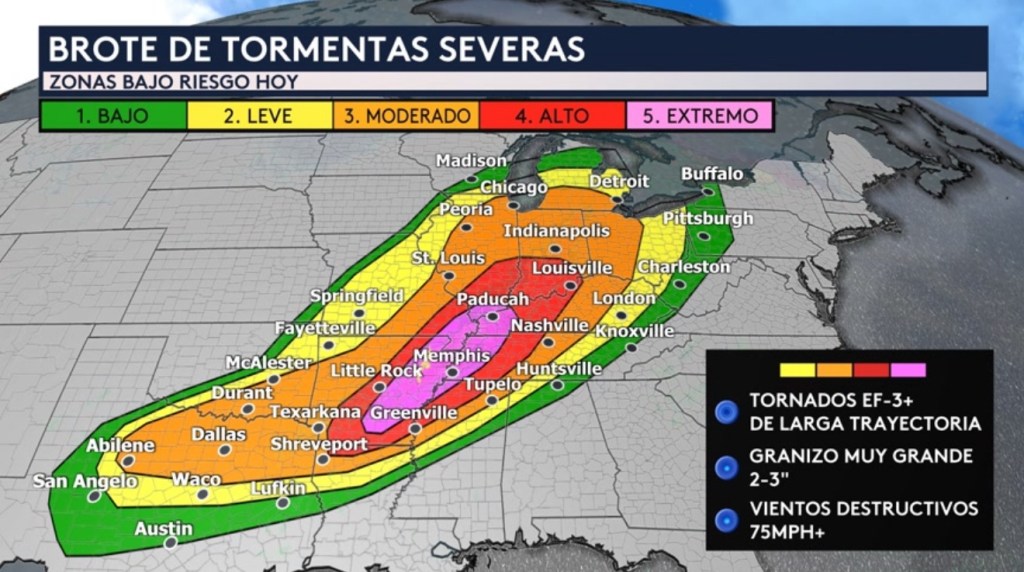El Centro de Predicción de Tormentas ha emitido el riesgo más alto en la escala de severidad para el tiempo severo hoy. Esto está representado por el color rosado que include las ciudades de Memphis en Tennessee y Paducah en Kentucky. Aunque esto representa la zona de riesgo extremo, también se verán los impactos significativos de estas tormentas en los colores rojos, anaranjados y amarillos. Se esperan tornados intensos de categoría EF-3 o mayor de larga trayectoria, granizo dañino muy grande de entre 2 a 3 pulgadas en diámetro (más grande que un limón) y vientos significativos de fuerza de huracán de más de 75 mph.
