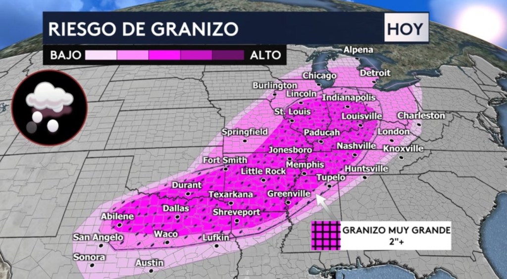 •Vemos las ciudades que están bajo cada riesgo. Comenzamos con el granizo, donde una gran zona desde Texas hasta Michigan pudiera ver granizo severo de más de una pulgada en diámetro (tamaño de una moneda de veinticinco centavos) o mayor. Pero la zona rayada es donde se pudiera ver granizo dañino muy grande de más de 2 pulgadas en diámetro. Esto incluye ciudades como Dallas, Abilene y Waco en Texas; Shreveport en Louisiana; Durant en Oklahoma; Little Rock, Texarkana y Jonesboro en Arkansas; Greenville y Tupelo en Mississippi; Memphis y Nashville en Tennessee; Paducah y Louisville en Kentucky; St. Louis en Missouri; Lincoln en Illinois; e Indianapolis y Fort Wayne en Indiana.