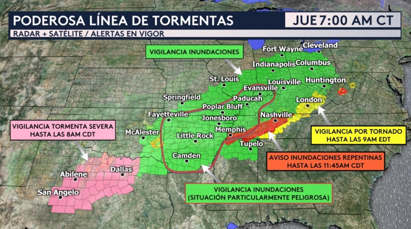 Hay una vigilancia por tornados para partes de Tennessee y Kentucky hasta las 9:00AM hora del este para ciudades como Nashville en Tennessee y London en Kentucky.