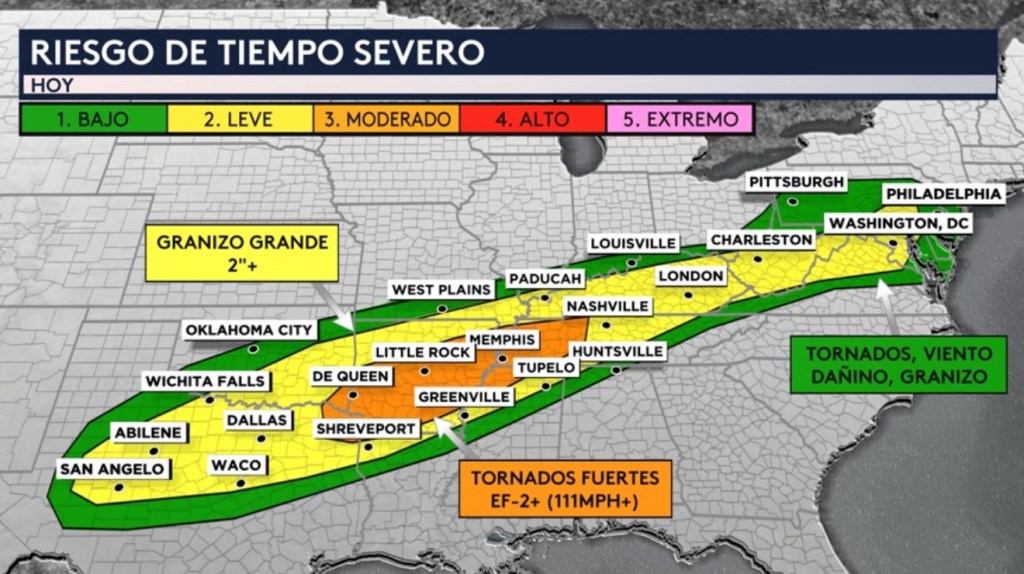 •El riesgo de tiempo severo sigue presente hoy para una estrecha zona desde Texas hasta Pennsylvania. En la zona anaranjada que representa un riesgo moderado (nivel 3 de 5 en la escala de severidad) es donde pudiéramos ver más tornados fuertes de categoría EF-2 o mayor (111 mph+). Incluye ciudades como Little Rock en Arkansas y Memphis en Tennessee.