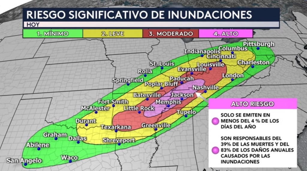 •Hoy habrá un riesgo significativo de inundaciones especialmente en la zona rosada donde hay un riesgo ALTO (el riesgo más alto en la escala de inundaciones). Esto incluye partes de Arkansas, Tennessee, Missouri y Kentucky y ciudades como Memphis y Jackson en Tennessee. Estos altos riesgos son raramente emitidos por el Centro de Predicción del Tiempo, solo en menos del 4 % de los días del año. Los días que se emiten un alto riesgo de inundaciones son responsables del 39 % de las muertes y 83 % de los daños anuales causados por las inundaciones en EE. UU.