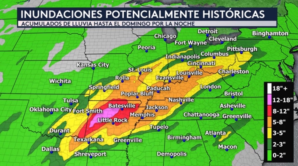 Se pronostican acumulados de lluvia importantes e inundaciones potencialmente históricas dentro un periodo prolongado desde hoy hasta el domingo por la noche. Más de 12 pulgadas de lluvia (además de lo que ya ha caído) son posibles en el estado de Arkansas mientras que más de 5 pulgadas son posibles en en todo Arkansas y los Valles de Mississippi y Ohio. Ciudades como Little Rock y Batesville en Arkansas; Memphis y Jackson en Tennessee; Paducah y Louisville en Kentucky; Evansville en Indiana, Popular Bluff y St. Louis en Missouri y Cincinnati en Ohio pudieran ver los acumulados de lluvia más altos.