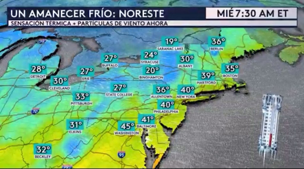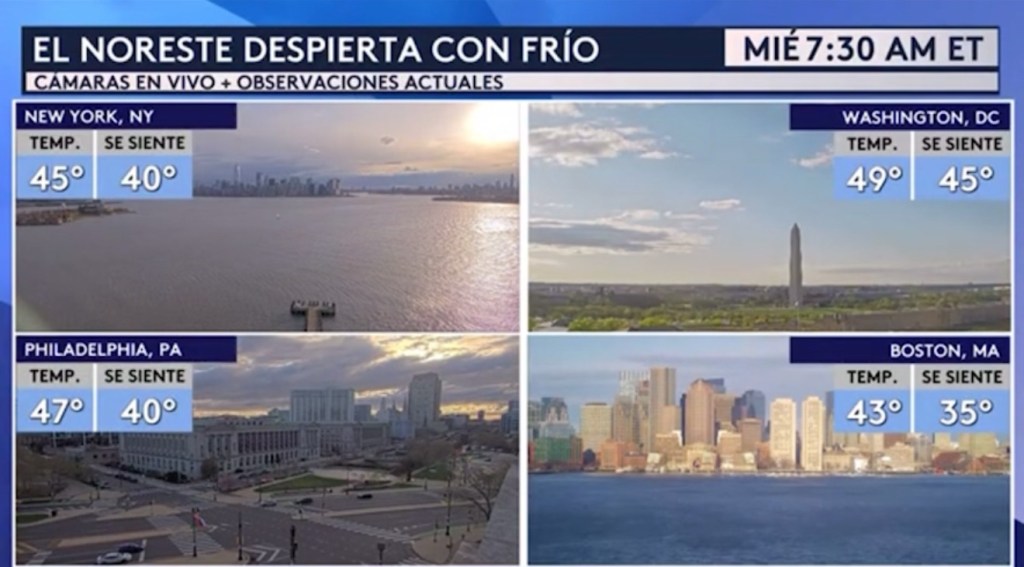 •Vemos nuestras cámaras en vivo desde Nueva York, Washington DC, Philadelphia y Boston donde estamos amaneciendo con frío. A esta hora de la mañana Nueva York se siente como los 39°, Philadelphia como los 39°, Washington DC como los 51° y Boston en los 34°.