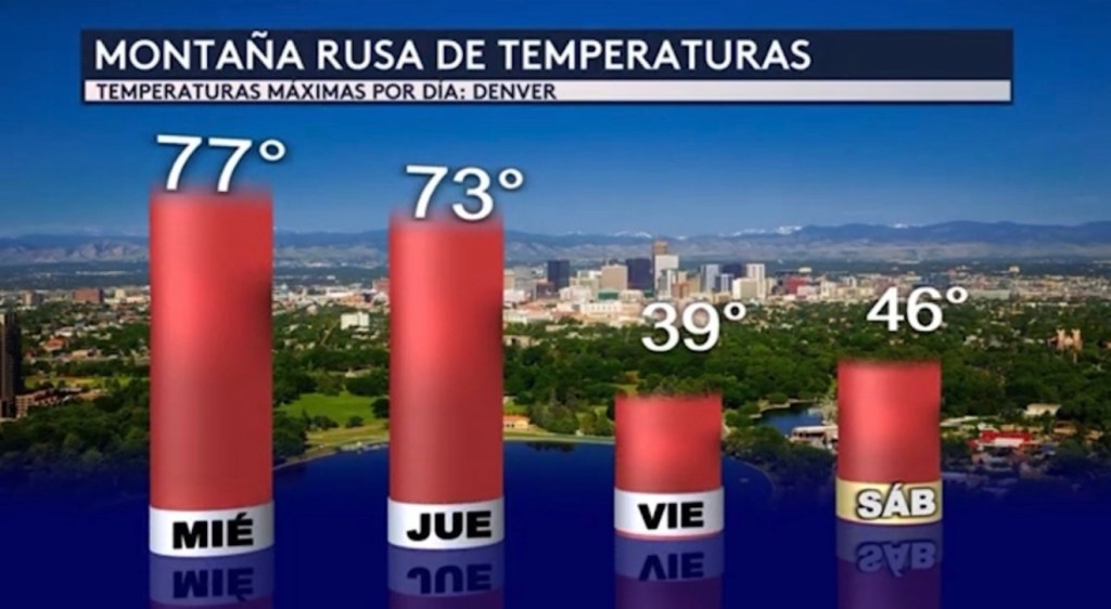 •Vemos el pronóstico de temperatura máxima por día para la ciudad de Denver en Colorado donde estaremos experimentando una montaña rusa de temperaturas. Las máximas hoy y mañana estarán en los 70° cuando la máxima promedio para esta época del año es 61°. Después de experimentar temperaturas cálidas hoy y mañana, miren lo rápido que desciende la temperatura máxima en Denver a partir del viernes debido a la llegada de las nevadas y un frente frío. ¡De 73° el jueves a 39° el viernes, lo que representará una máxima 22° por debajo del promedio!