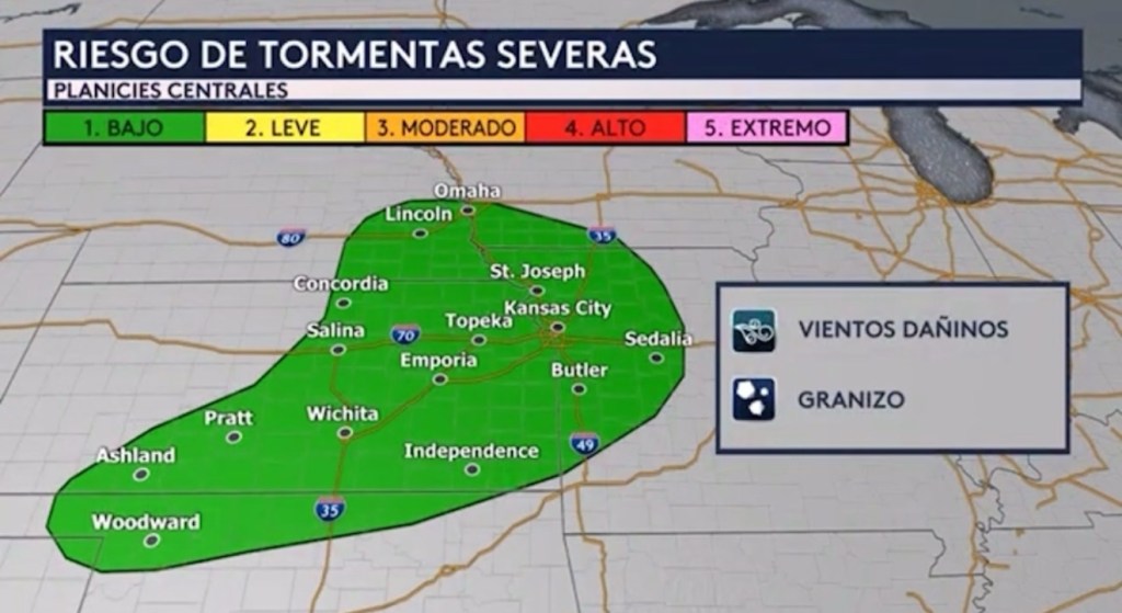 •Para esta noche, se espera que un sistema de baja presión y algunas características frontales traigan tormentas eléctricas dispersas a las planicies centrales del país. Habrá un riesgo de tiempo severo que se extiende desde Texas hasta Iowa y incluye ciudades como Kansas City, Topeka, Wichita, Lincoln y Omaha. Las amenazas principales con estas tormentas nocturnas serán granizo y ráfagas de viento dañinas.