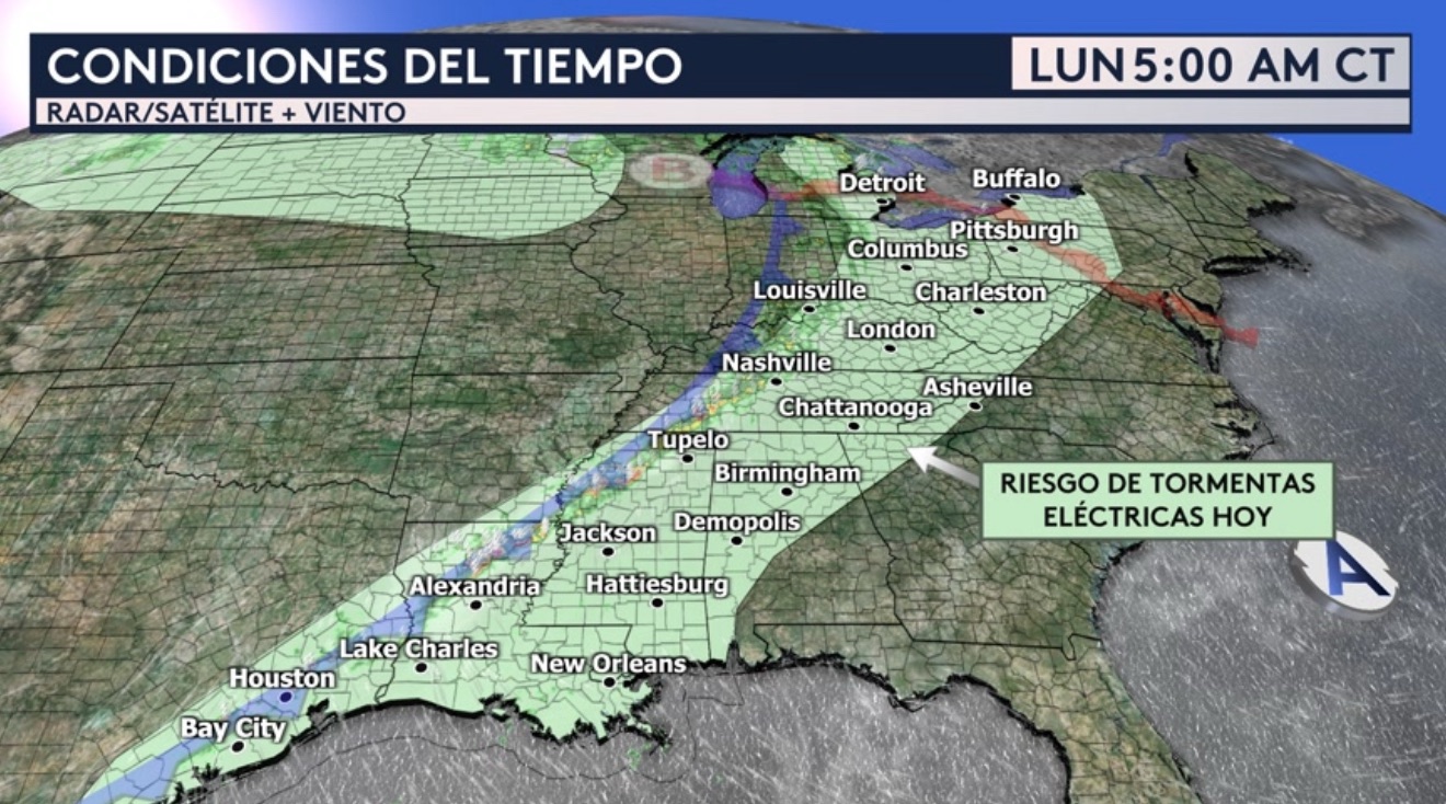 Debido a esta línea de precipitación a lo largo del frente frío que seguirá avanzando al este durante esta jornada se espera el riesgo de tormentas eléctricas para una estrecha zona desde Texas hasta Michigan. Bajo este riesgo se encuentran las ciudades de Houston, Nueva Orleans, Jackson, Birmingham, Nashville, Asheville, Louisville, Columbus, Pittsburgh, Buffalo y Detroit.