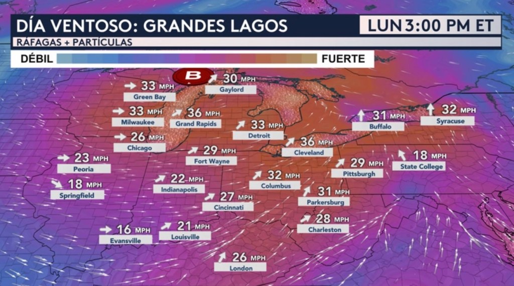 •Este mismo sistema frontal traerá condiciones ventosas para los Grandes Lagos hoy en los alrededores del centro de baja presión. Las ráfagas de viento estarán oscilando entre las 20 y 40 mph para ciudades como Chicago, Milwaukee, Detroit, Cincinnati, Columbus, Cleveland, Pittsburgh, Indianapolis, Buffalo y Syracuse.