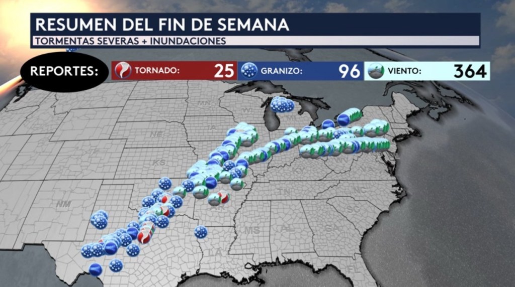 •Fue un fin de semana activo en el país con 25 reportes de tornado, 96 de granizo y 364 de viento dañino desde Texas hasta el estado de Nueva York. No solo tuvimos lidiando con tormentas eléctricas severas sino también con las fuertes lluvias.