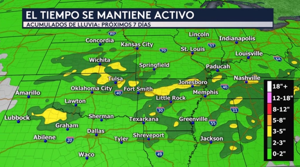 •El tiempo se mantendrá activo para esta misma zona del país esta semana. Los acumulados de lluvia estarán en el rango de 2 a 5 pulgadas durante los próximos 7 días que incluyen los estados recién afectados este fin de semana como Texas, Oklahoma, Kansas, Missouri y Arkansas.