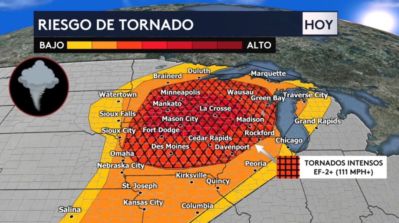•Las amenazas más significativas del día serán los tornados y el granizo grande. El riesgo de tornado más alto será para el Medio Oeste donde en la zona sombreada se espera la posibilidad de tornados intensos de categoría EF-2 o mayor (111 mph+). Esto incluye las ciudades de Minneapolis, St. Paul, Mankato y Rochester en Minnesota; Des Moines, Ames, Mason City, Fort Dodge, Cedar Rapids, Waterloo, Davenport y Dubuque en Iowa; La Crosse, Wausau, Green Bay y Madison en Wisconsin y Rockford en Illinois. Todos los residentes de estas ciudades deben conocer su lugar de refugio en caso de que reciban un aviso por tornado.
